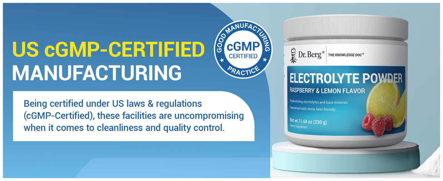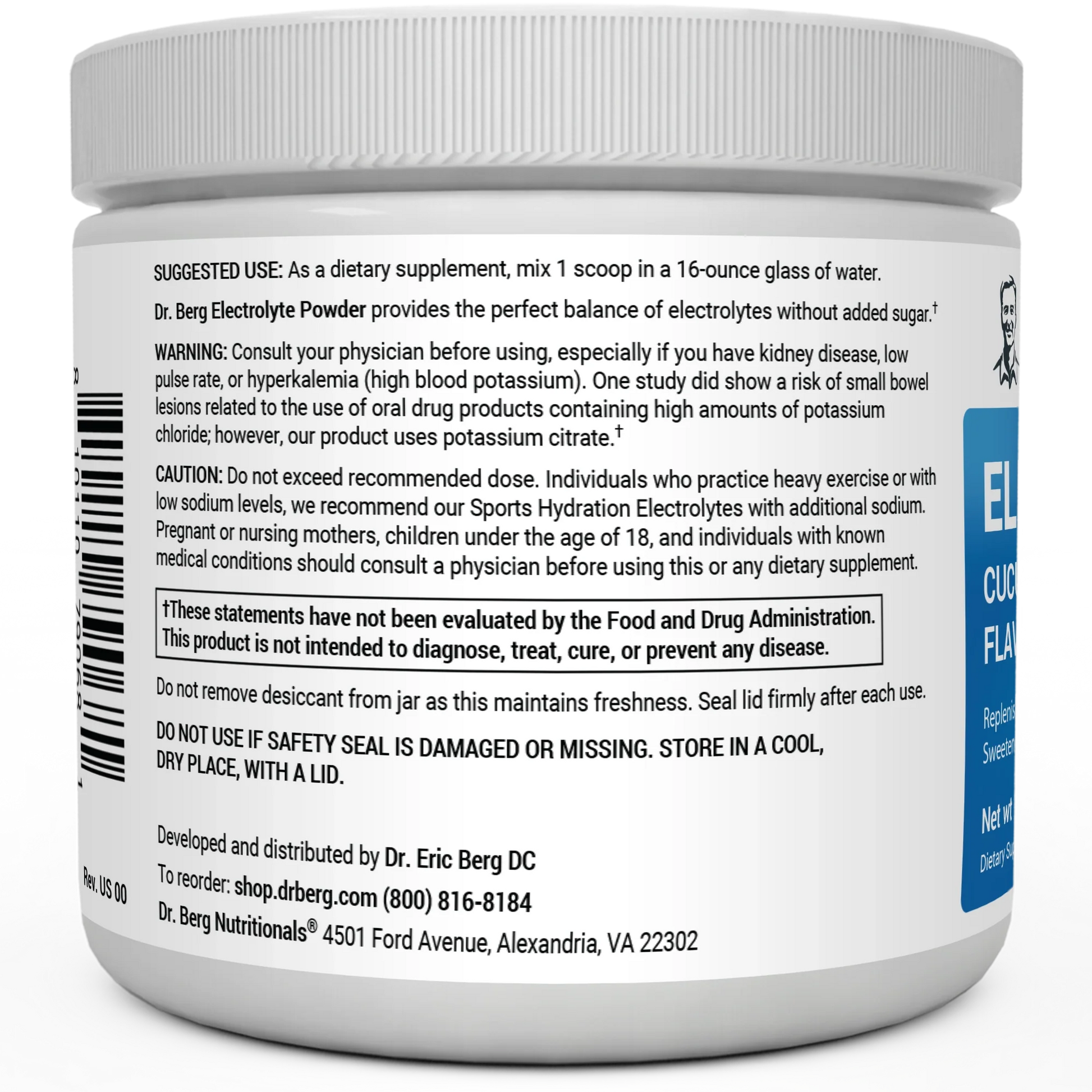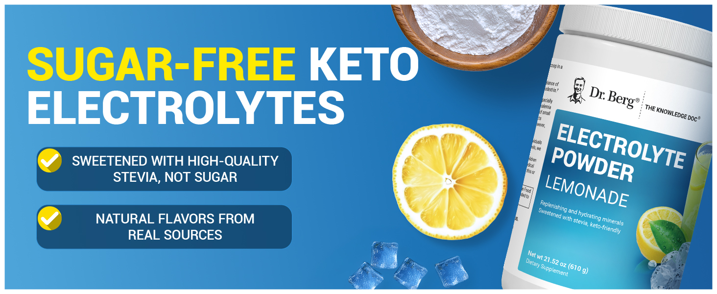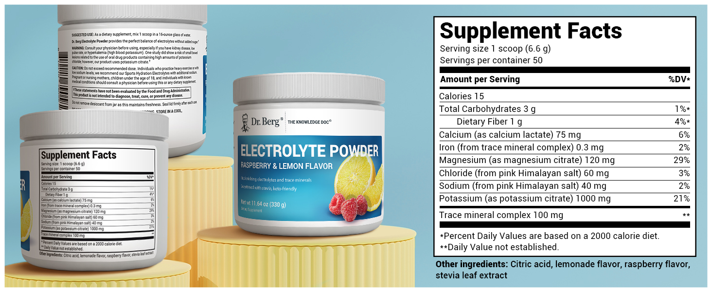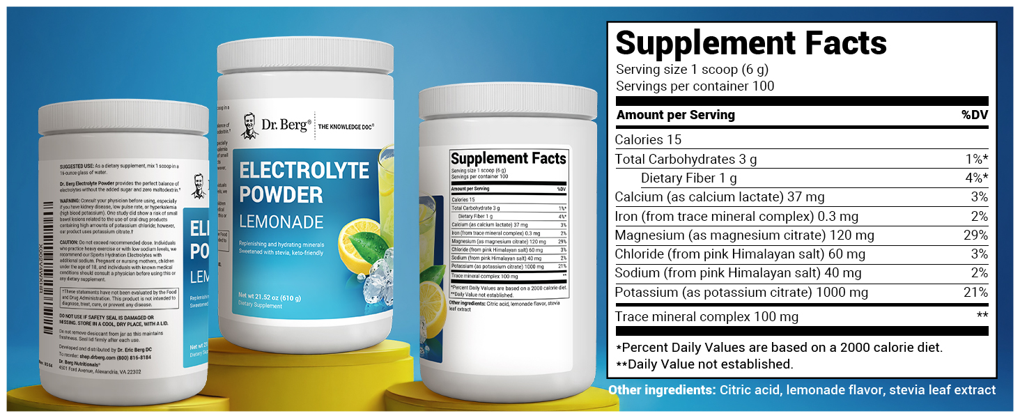 Dr. Berg electrolyte powder delivers a high-quality boost of essential electrolyte minerals, featuring an impressive 1000 mg of potassium per serving.